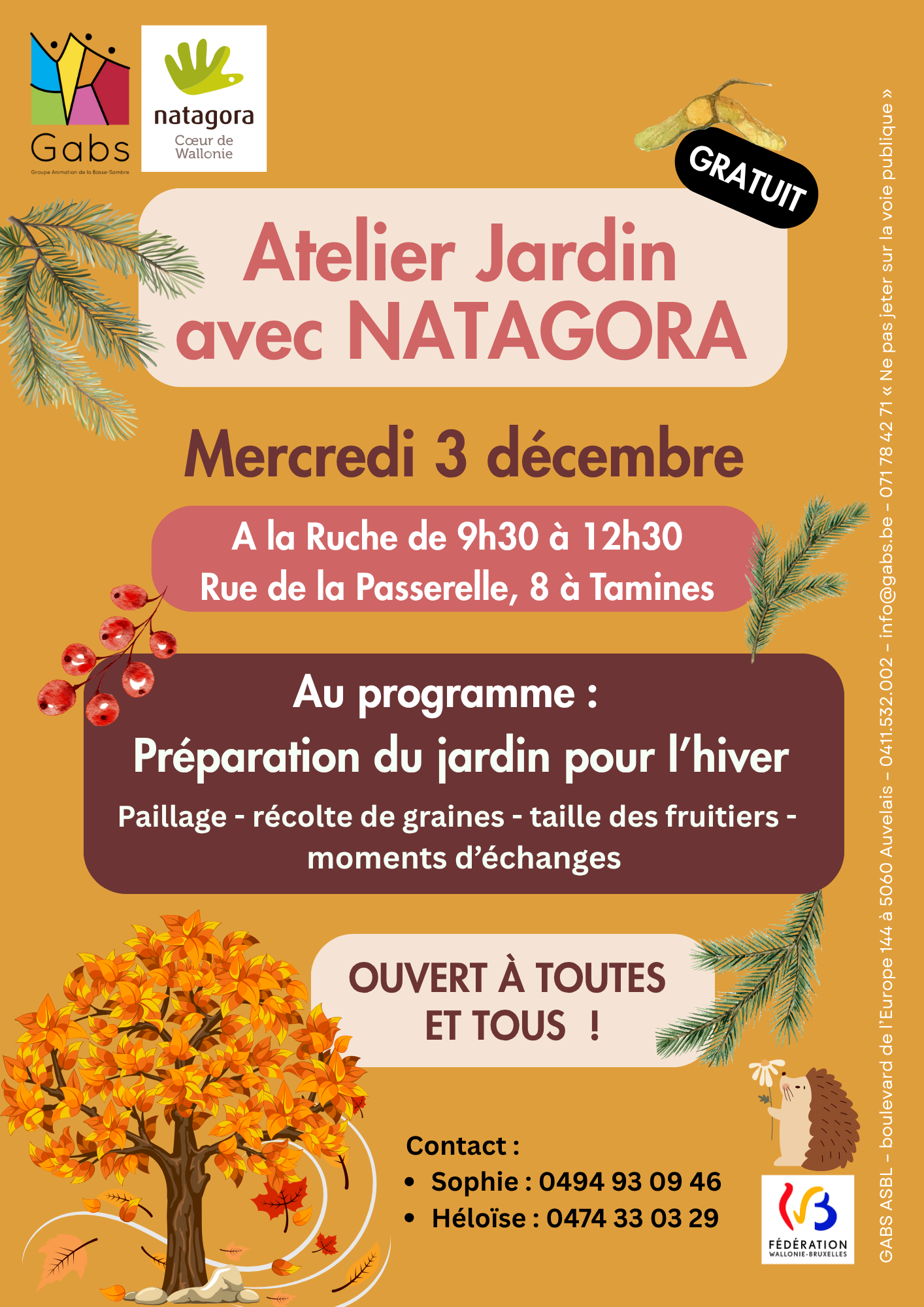 La Ruche Rue de la Passerelle 8, 5060, TaminesAu programme : Préparation du jardin pour l'hiver Paillage - récolte de graines - taille des fruitiers - moments d'échanges Ouvert à toutes et tous ! Contact