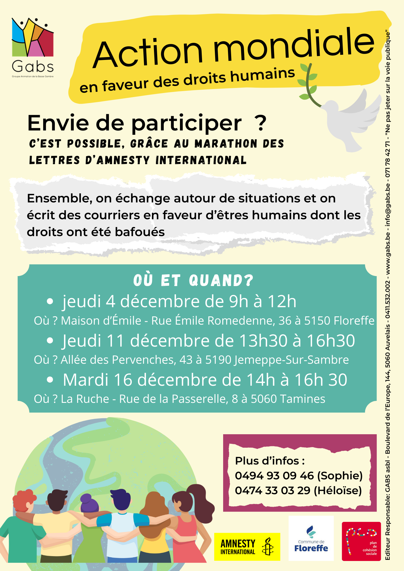 Ensemble, on échange autour de situations et on écrit des courriers en faveur d'êtres humains dont les droits ont été bafoués. Envie de participer ? C'est possible, grâce au marathon des lettres d'Amnesty International ! Contact :